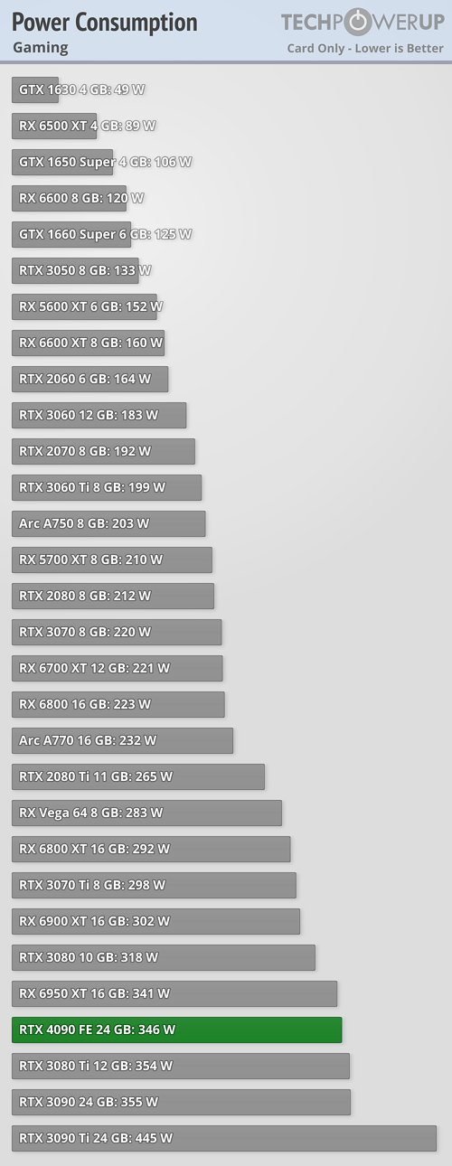 TechPowerUp naměřil průměrnou herní spotřebu 346 wattů (což je dokonce méně než u GeForce RTX 3090), ale maximální spotřebu 468 wattů, což přesahuje TDP a je o více než 100 wattů nad GeForce RTX 3090.