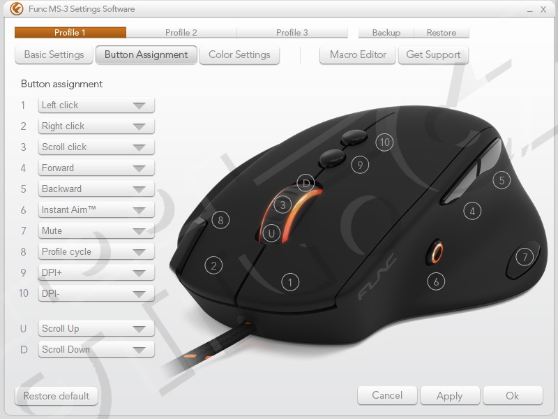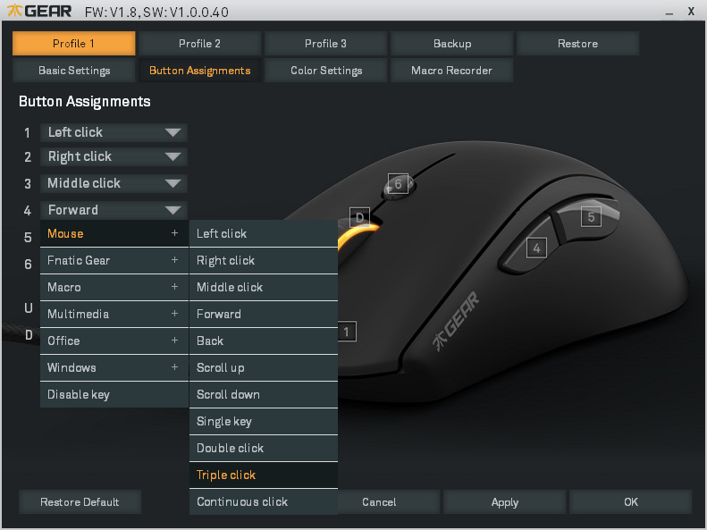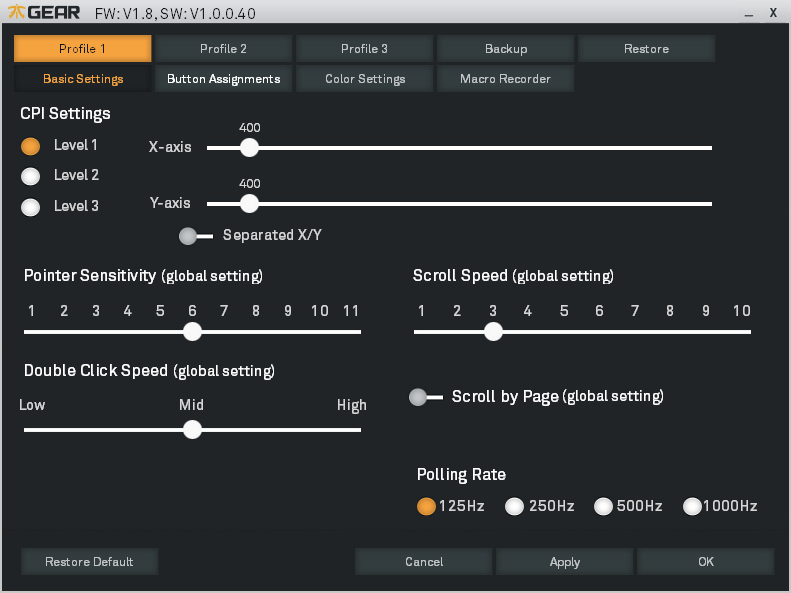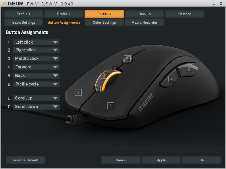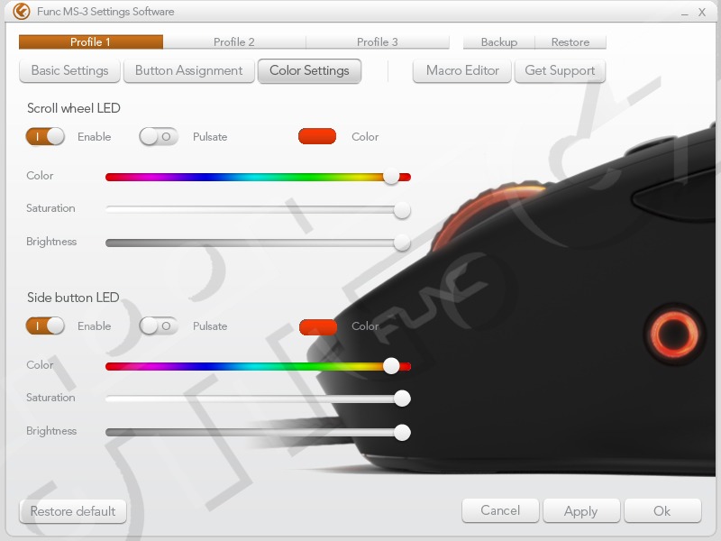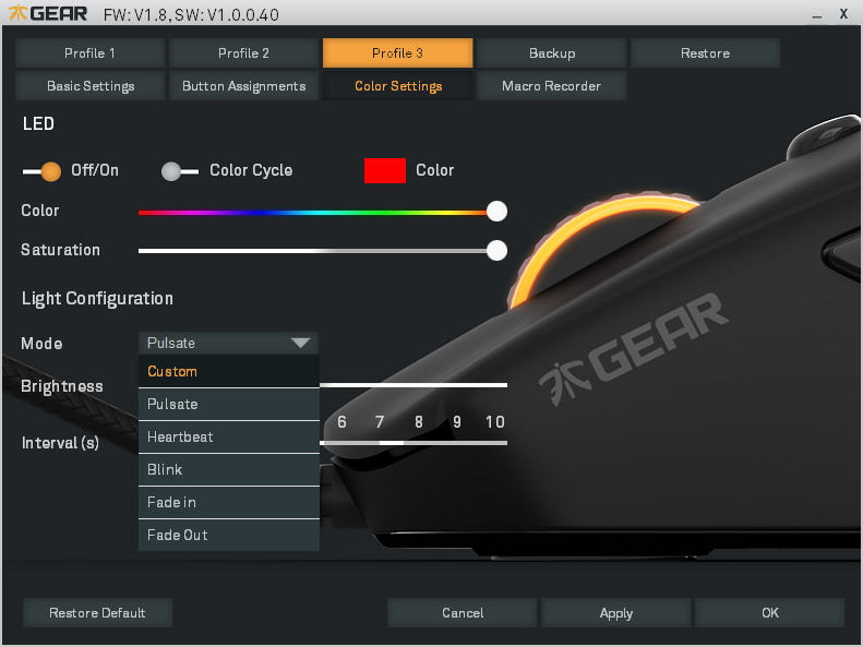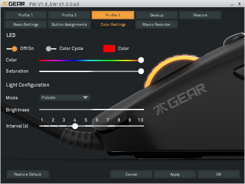 Obslužný software podporuje makra a profily, který lze uložit hned několik. Také je zde plně nastavitelné LED podsvícení kolečka, což bude asi první věc, kterou budete řešit, ať už chcete, aby myš blikala, či naopak neblikala.