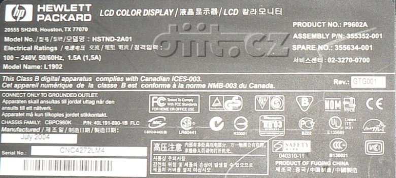 Hewlett-Packard L1902 je 19'' monitor s TN panelem o rozlišení 1280×1024. Udávaná odezva je 16 ms (rise+fall), což odpovídá technologickému stáří. Tento konkrétní kus byl vyroben v červnu 2004, má tedy již 10 let. Ani kontrast není nijak vysoký, 500:1. Vybaven je pouze vstupem D-Sub, nicméně celkově to na nějaké weby ještě stačí. Navíc má z výroby madlo a dá se tak přenášet... :-)
