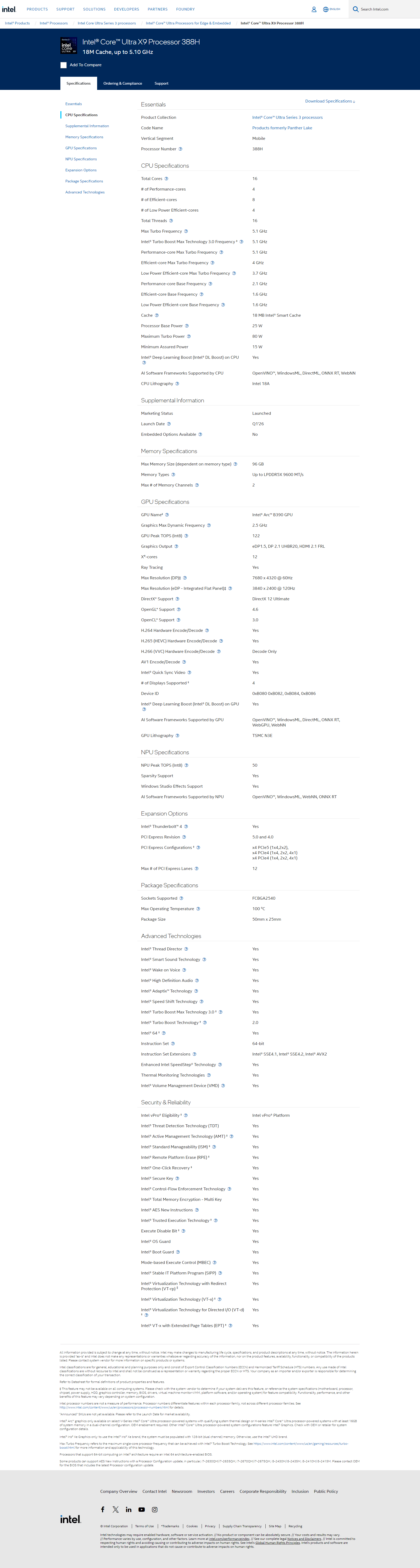 Oficiální specifikace Intel Core Ultra X9 388H na webu Intelu (Intel)