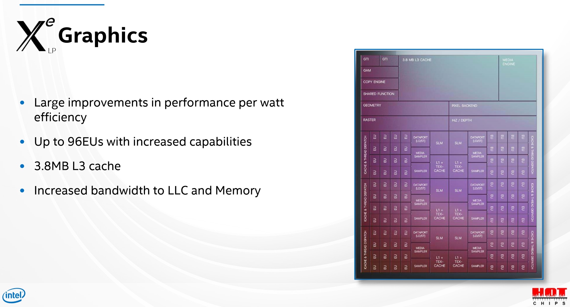 Intel sice s Tiger Lake navyšuje počet grafických jednotek z 64 na 96, tedy o 50 %, ale většina výkonu nepůjde na vrub této změně, ale změnám v efektivitě. Jak energetické, díky níž bude grafické jádro v zátěži schopné dosahovat vyšších frekvencí, tak efektivitě na výpočetní jednotku. Jedním z prvků, který k tomu dopomůže, je grafická L3 cache o kapacitě 3,8 MB. Téměř čtyřmegabajtová cache určená čistě potřebám integrované mobilní grafiky je něco nevídaného. Pro srovnání a lepší představu: AMD v současnosti herní grafickou kartu Radeon RX 5700 XT s jádrem Navi 10 vybavuje 4 MB cache poslední úrovně.