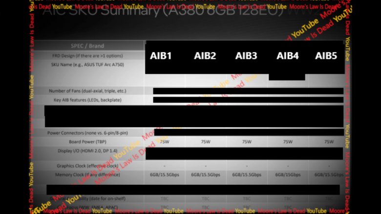 Nebudeme rozebírat každý jeden výrok a každý jeden rozpor (ve zdrojích pod článkem najdete odkaz na celé 24minutové video), ale podívejme se na jednu drobnost, které si autor videa nevšiml. Výše je vidět částečně zcenzurovaný slajd Intelu, který shrnuje parametry plánovaných desktopových karet Arc A380 vyráběných různými výrobci (jednotlivé sloupce). Neřešme, že se do výroby nakonec (nebo dosud?) pustil jen Gunnir a ASRock. Všimněte si, že Intel u všech výrobců od začátku počítal s maximálně 15,5GHz taktem pamětí. Navzdory tomu oficiální specifikace Arc A380 zveřejněné v den vydání hovořily o 16GHz pamětech a tento údaj Intel v oficiálních specifikacích na webu opravil až na základě kritiky médií. Tehdy se zdálo, že šlo o přehlédnutí nebo opomenutí, jenže ze slajdu je zjevné, že se nepočítalo s jediným modelem, který by měl paměti nastavené na 16GHz. Paradoxně u jednoho výrobce („AIB4“) Intel od začátku počítal pouze s 15GHz pamětmi, přesto ve specifikacích sliboval 16GHz a nyní hovoří o 15,5GHz. Pokud onen výrobce skutečně kartu s 15GHz vydá, bude Intel opět měnit specifikace na webu?