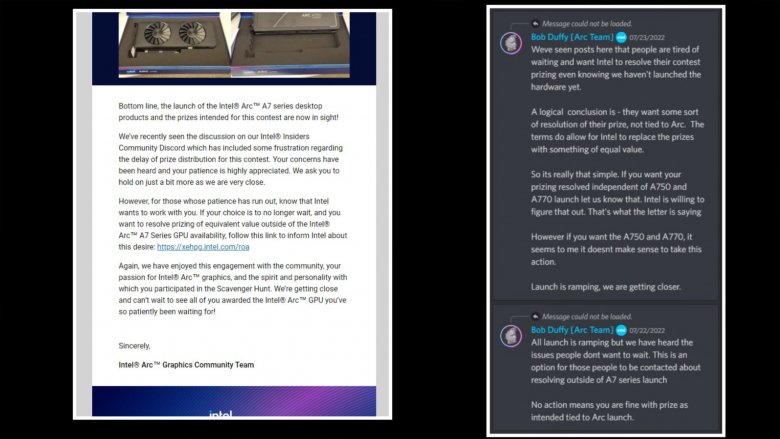 Na druhé straně pak stojí stížnosti uživatelů, kteří se zúčastnili soutěže o grafické karty Arc a dosud nedostali výhru. Intel na tyto stížnosti reagoval výzvou cílenou k těm výhercům, kteří již nechtějí čekat, aby se obrátili na společnost, která jim poskytne kompenzaci. Zatímco se jedna skupina marketingových pracovníků snaží přesvědčit uživatele, že dostupnost karet je za dveřmi, druhá skupina nedokáže říct výhercům ani přibližné datum, kdy hotové karty dostanou.