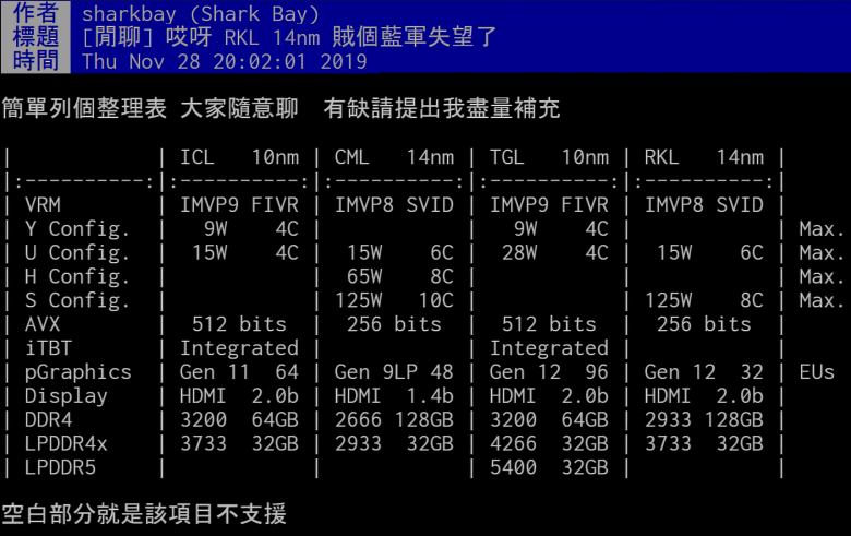 Zavedený leaker momomo_us na Twitteru zveřejnil tabulku popisující maximální konfigurace chystaných platforem Intelu. Ve sloupcích najdete jednotlivé generace (ICL = Ice Lake, CML = Comet Lake, TGL = Tiger Lake a RKL = Rocket Lake).