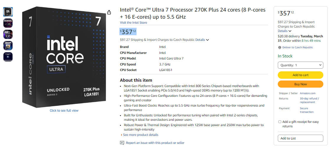Intel se ani nepokouší o oficiální cenu, Core Ultra 7 270K+ stojí $349-$357