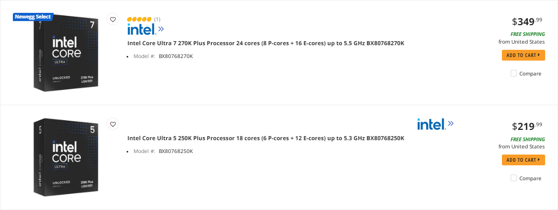 Core Ultra 5 250K+ namísto avizovaných $199 začíná na $220 (NewEgg, Amazon ho reálně v okamžiku vzniku tohoto textu vůbec nenabízí a prodává pouze Core Ultra 5250KF+ bez grafiky, které místo oficiálních $184 stojí $227, tedy o 23 % dráž). Core Ultra 7 270K+, které by mělo stát $299, má Amazon za $357 a NewEgg za $349. Za tuto částku ho má i Microcenter. Ani jeden ze dvojice největších amerických obchodů tedy Arrow Lake-refresh nenabízí za oficiální cenu.