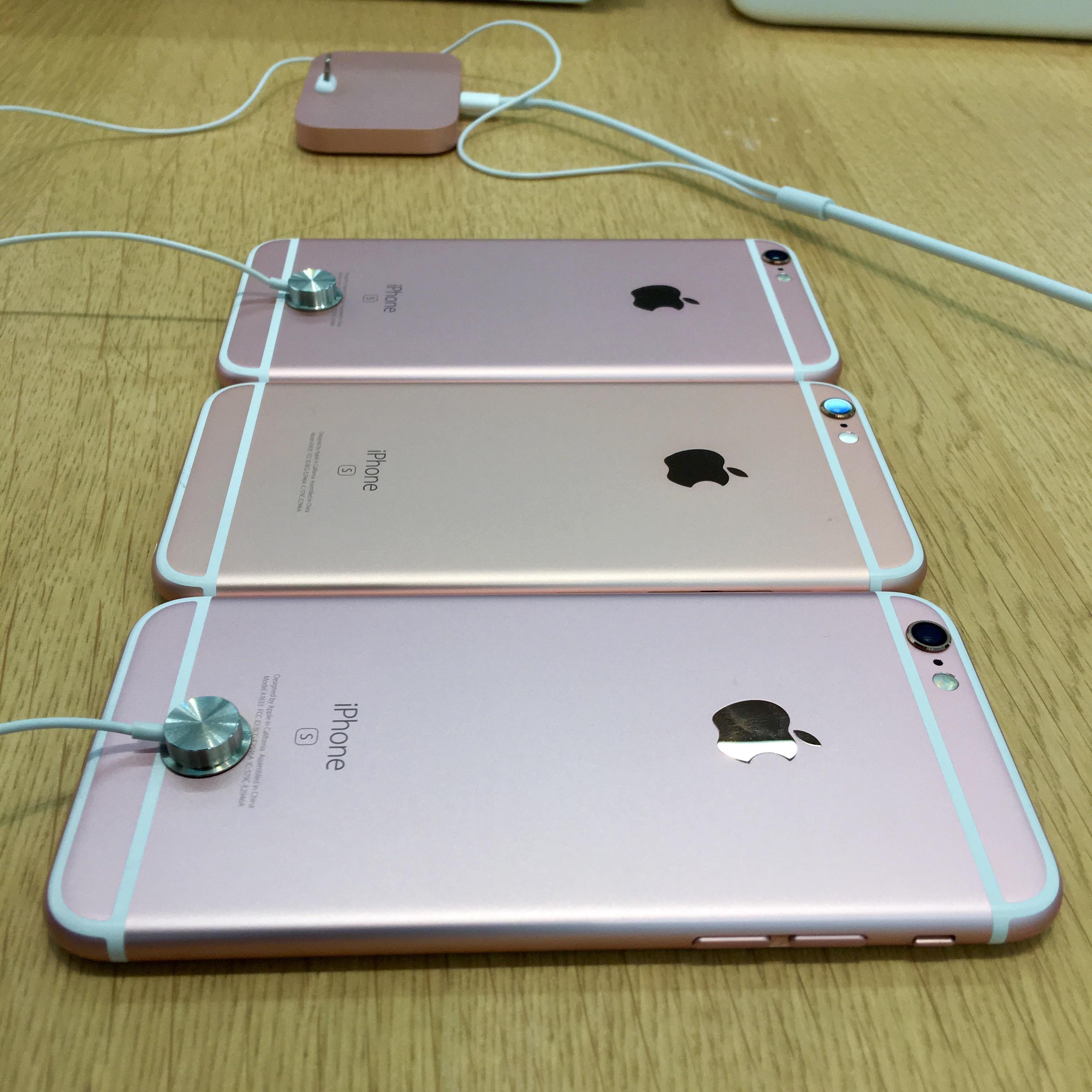 Dvojice dlouhodobě vystavených iPhone 6S Rose Gold a (uprostřed) čerstvě vybalený kousek (PCBen)