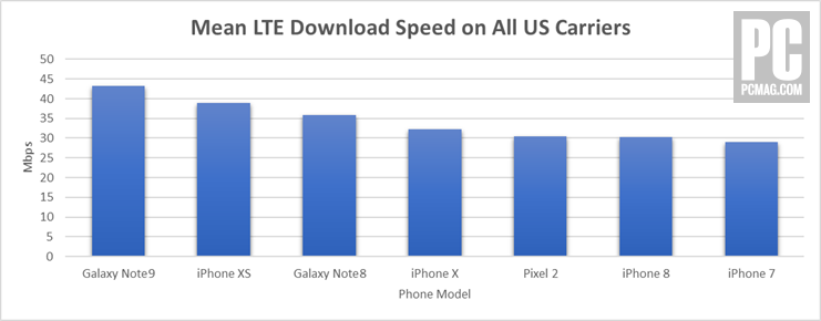 Další test ukazuje zrychlení datových přenosů mezi iPhone X (Intel) a iPhone XS (Intel) v závislosti na poskytovateli (USA):