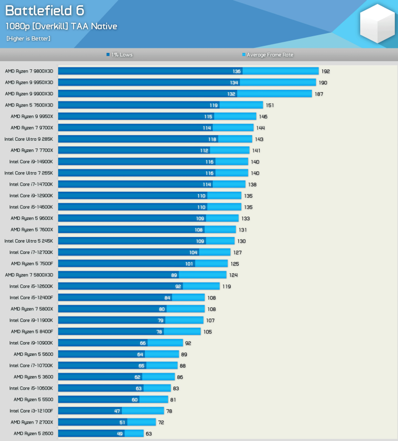 Mezi pěti nejrychlejšími CPU pro Battlefield 6 nefiguruje žádný od Intelu