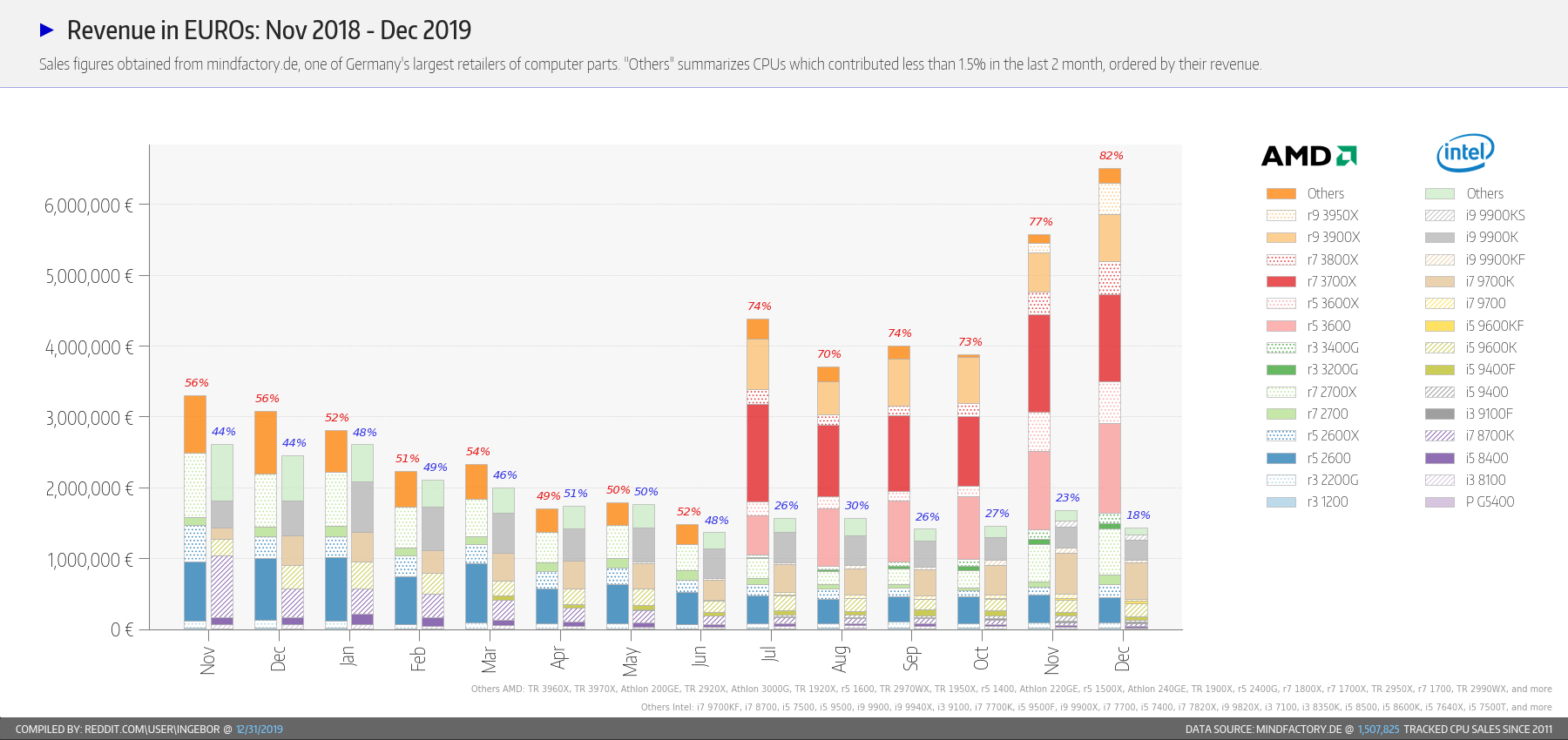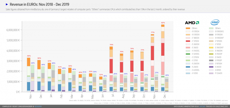 Pokud jde o rozložení z hlediska cen, má podstatný vliv fakt, že aktuálně nejprodávanějším procesorem Intelu je Core i7-9700K, tedy high-end, kdežto u AMD tvoří velkou složku prodejů Ryzen 5 3600, tedy mainstream. Z peněz, které zákazníci utratí za procesory, je tedy 82 % vydáno za produkty AMD (na prodané kusy to bylo 86 %) a 18 % za Intel (na prodané kusy to bylo 14 %). Určitou roli má i fakt, že některé procesory Intelu v prosinci dokonce zdražily, jmenovitě např. Core i9-9900K a zmíněný Core i7-9700K.