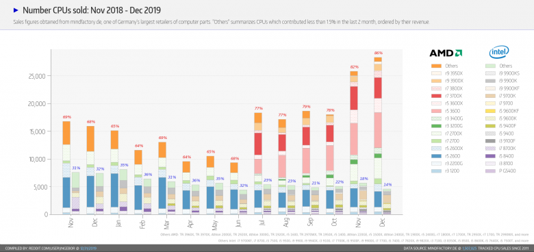 Grafům retailových prodejů jsme se věnovali naposledy za září 2019. Poté jsem konstatoval, že dokud se situace výrazněji nezmění, nemá smysl jí nadále řešit. Od července (tedy od vydání Ryzen 3000) do října se totiž téměř nic nezměnilo a vydávat pravidelné články v duchu: „nic se nemění, zachovejte paniku“, asi nemá valného smyslu. Ke změně došlo v listopadu, té jsme se ovšem rovněž nevěnovali, jenže data za prosinec ukazují, že nešlo jen o jednorázový výkyv - naopak, podíl Intelu dále poklesl, podíl AMD ještě posílil a největším překvapením pak je, že prodeje šestnáctijádrového Ryzen 9 3950X se dostaly nad rozlišovací schopnost grafu, takže v něm mají vlastní místo a nespadají do kategorie „ostatní“.