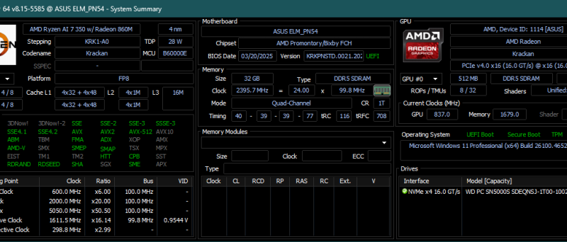 Od ASUSu zde byly osazené dva 16GB DDR5-5600 CL46 moduly a SSD společnosti WD, jedná se spíše o levnější DRAM-less SSD, takže od něj nečekejme zázraky.