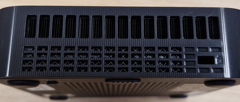 Na zadní straně je zbylá portová výbava. Najdeme zde jeden USB4 port ve formě USB-C 40Gb/s s podporou DisplayPortu 2.1. Dále zde najdeme dva velké DisplayPorty 1.4 a HDMI 2.1 výstup. iGPU v procesoru podporuje až tři monitory. Nechybí zde samozřejmě DC jack pro napájení, USB-A 10Gb/s a rovnou dva RJ45 konektory připojené do Realtek RTL8125 čipsetů, každý poskytuje až 2,5GbE, což je na malou krabičku velmi hezké.