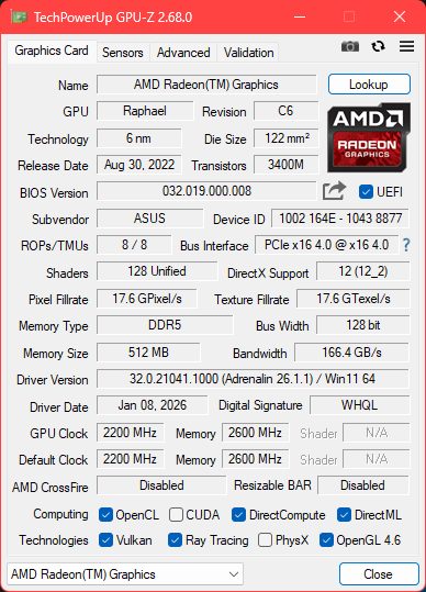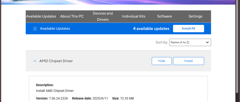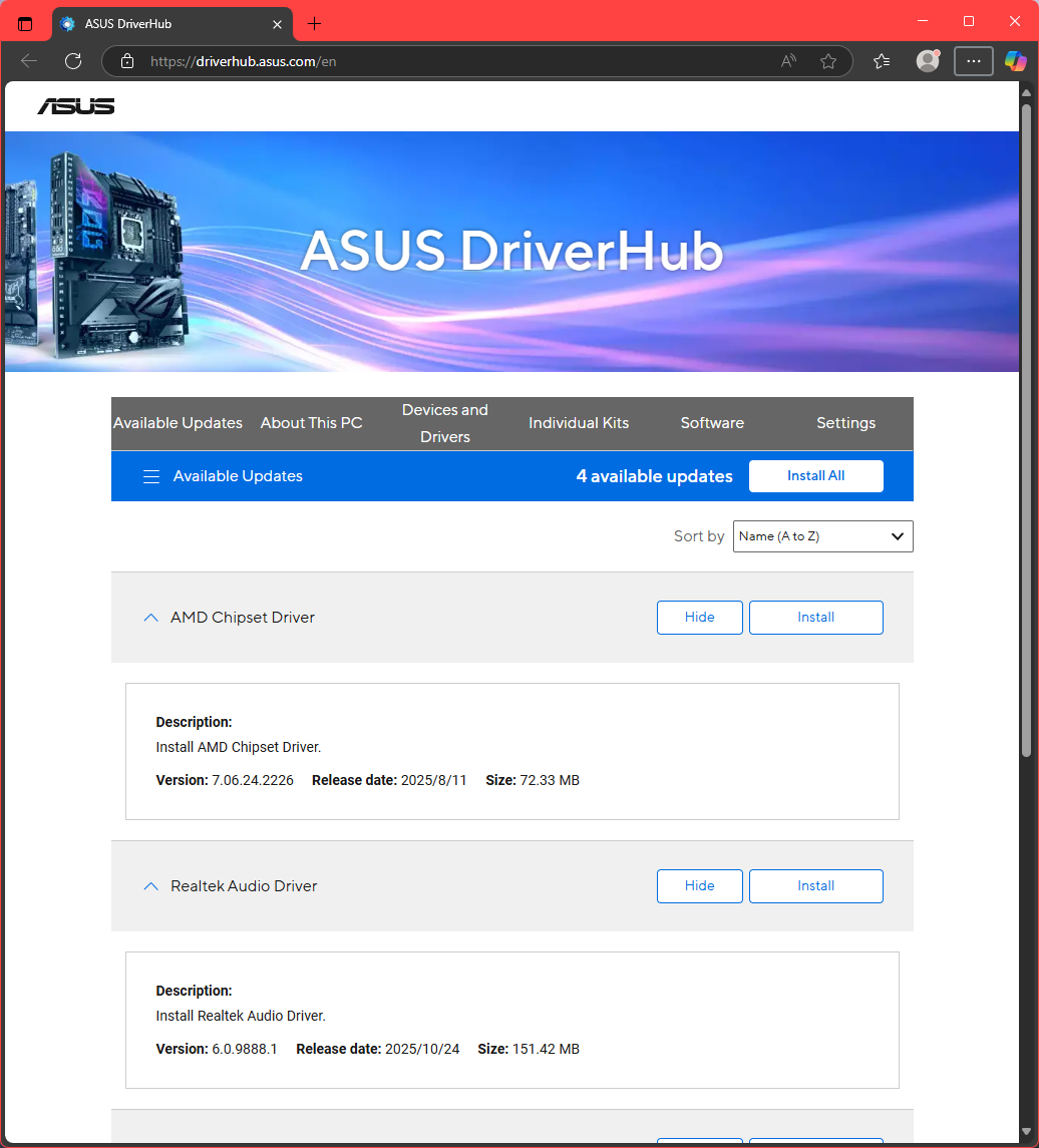 Na počítač jsem nainstoval operační systém MicroSlop Windows 11 Pro 24H2 a aktuální ovladače. ASUS nabízí instalaci utility ASUS DriverHub, která umožňuje instalovat ovladače z prostředí webového prohlížeče. Ovladače čipové sady a grafického adaptéru jsem použil přímo ze stránek AMD.