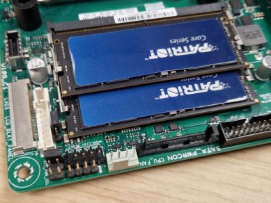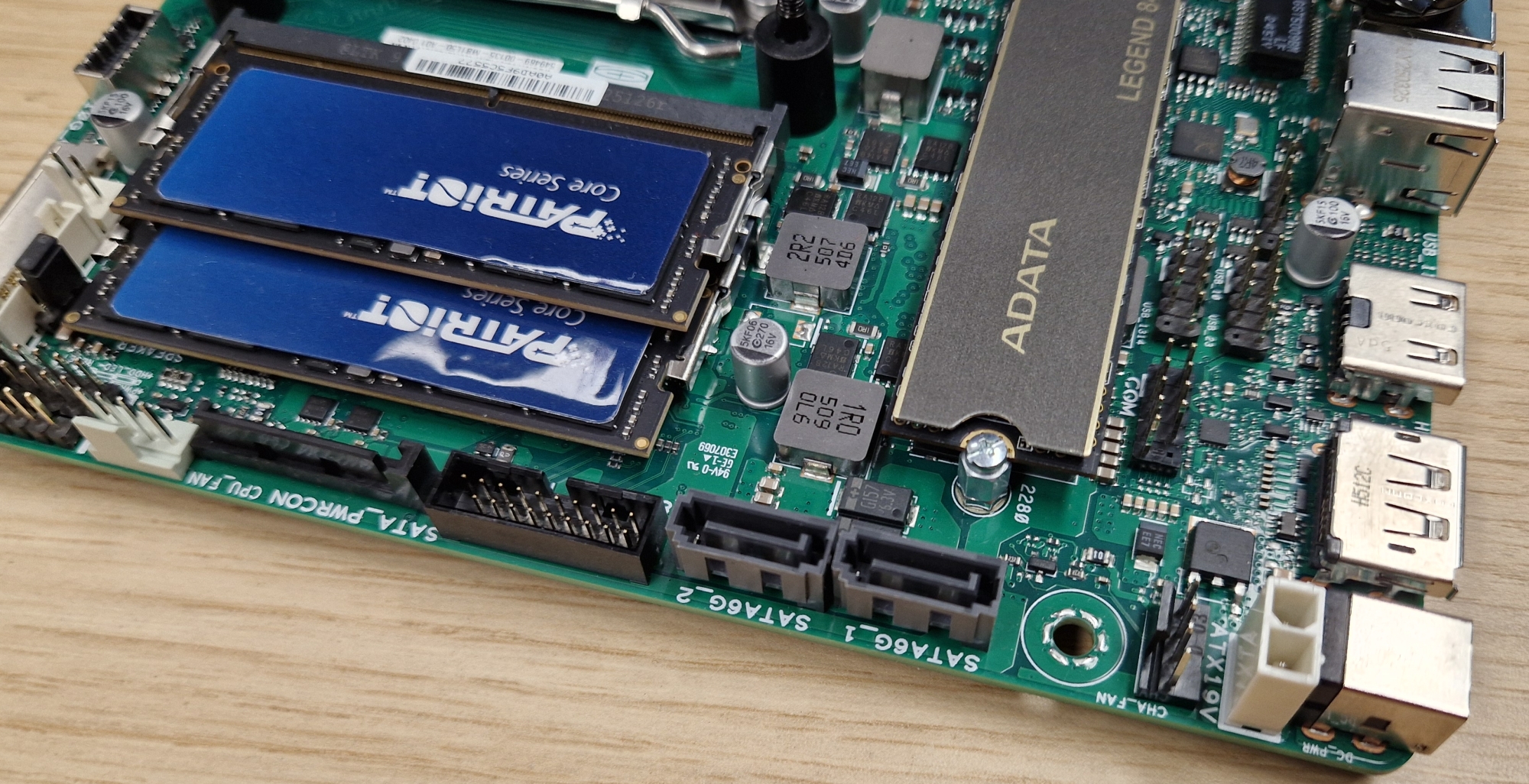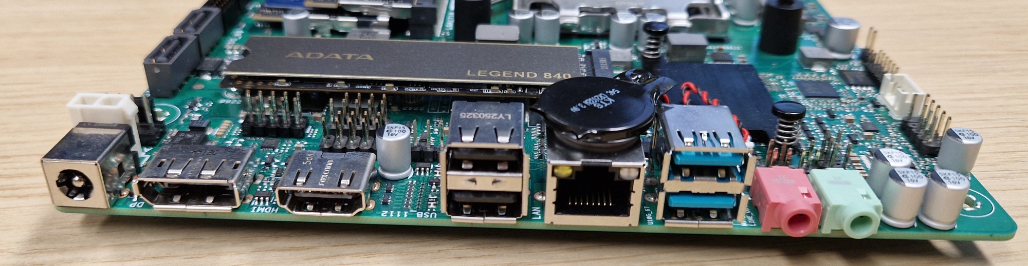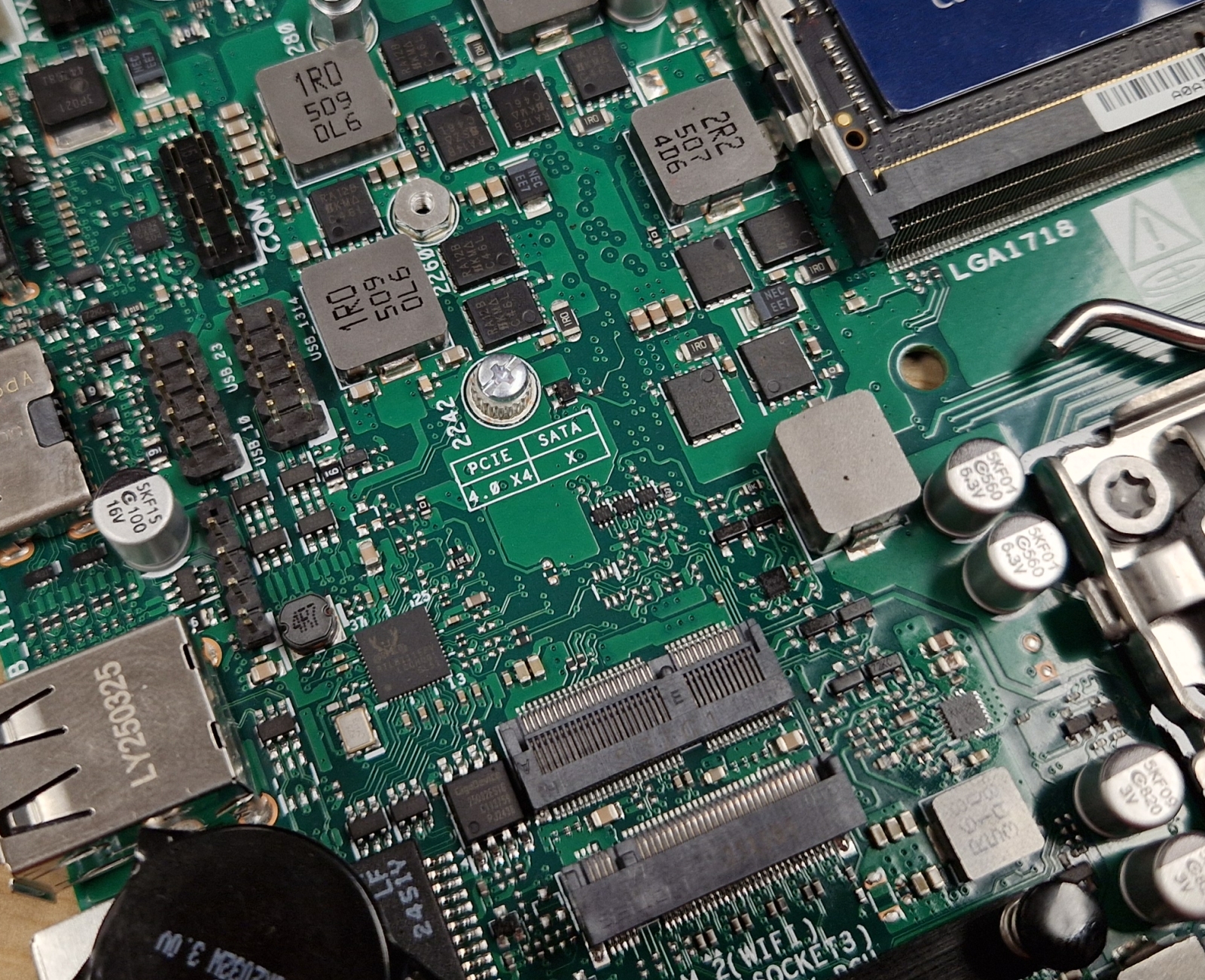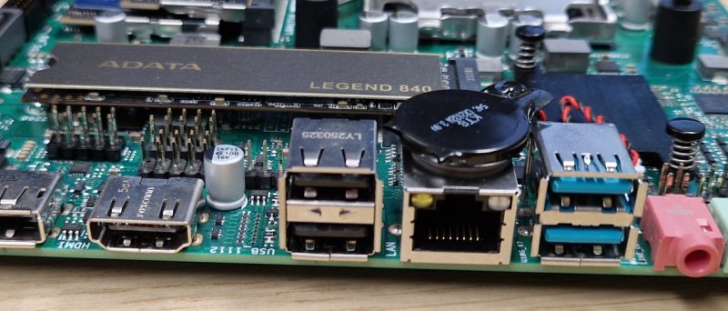 Deska bohužel nenabídne žádný velký PCIe x16/x8/x4/x1 slot, pouze dva M.2 sloty. Jeden je určen pro M.2 2232 WiFi karty a druhý nabídne čtyři PCIe linky pro hlavní až 80mm dlouhé PCIe NVMe SSD. Druhé NVMe SSD bohužel přímo na desku neosadíme. Já jsem osadil testovací ADATA LEGEND 840 1TB SSD.