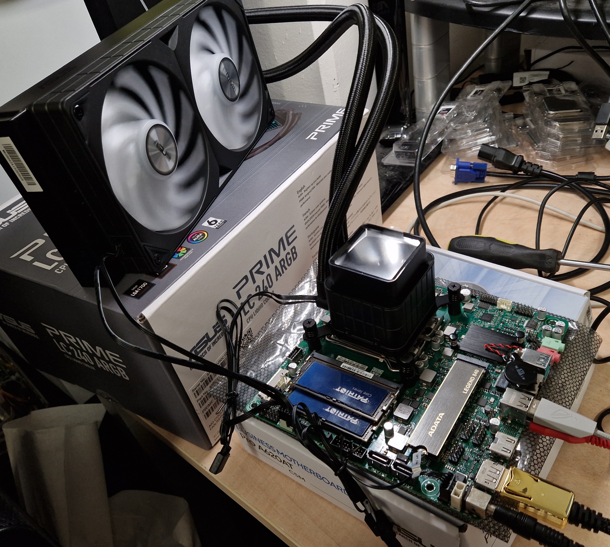 Socket AM5 bohužel používá montážní otvory pro Intel chladiče, konkrétně LGA1710. Bohužel takový Intel box jsem někam uklidil a nedokázal jsem ho najít, pouze různé starší varianty pro LGA1150 a podobné. Požádal jsem tedy ASUS, zda nemají nějaký entry level chladič pro LGA1700 a byl mi zaslán kanón na vrabce a to sice ASUS PRIME LC 240 ARGB vodní chladič, což je na tuto sestavu opravdu overkill.