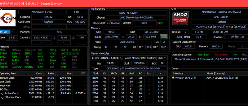 Další snížení výkonu nám přichystaly paměti, osadil jsem dva Patriot Core 24GB DDR5-5600 moduly, které mi přistály v šuplíku. Nemají EXPO/XMP profil a deska sama použila JEDEC standard a propustnost 5200 MT/s. V tomto režimu jsem také testoval, zkusil jsem nastavit manuálně 5600 MT/s propustnost a to fungovalo bez potíží. Nicméně očekávám, že cílová klientela komponenty do této desky prostě osadí a nijak je ladit nebude.