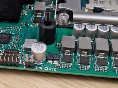 Deska má samozřejmě kupu standardních pinovišť pro zapínací tlačítka, LEDky, ventilátory, USB3.0 19pin header, USB-C header, externí TPM, sériový port, USB2.0, dva SATA porty a tak podobně.