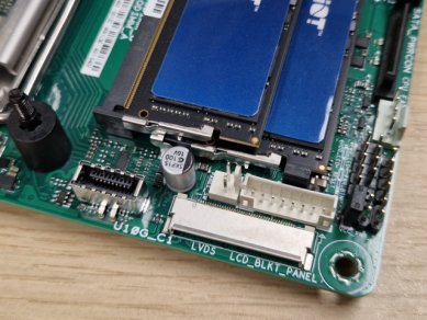 Mezi speciality se řadí konektor s LVDS výstupem, což umožní připojit všelijaké displeje, LVDS rozhraní se hojně používalo v noteboocích, ale mohou ho klidně používat i nějaké kiosky, pokladny a další zařízení. Deska má tak na sobě nativní LCD driver a přímo v BIOSu můžeme některá rozlišení nastavit. Ve své zásobě mám několik FHD LVDS notebookových panelů, ale nemám vhodný konektor, protože jsem je používal s HDMI LCD drivery.