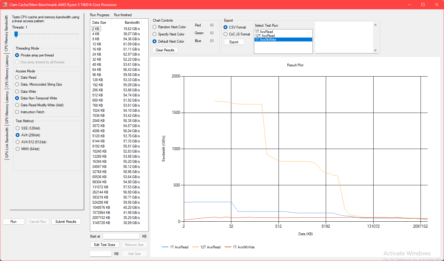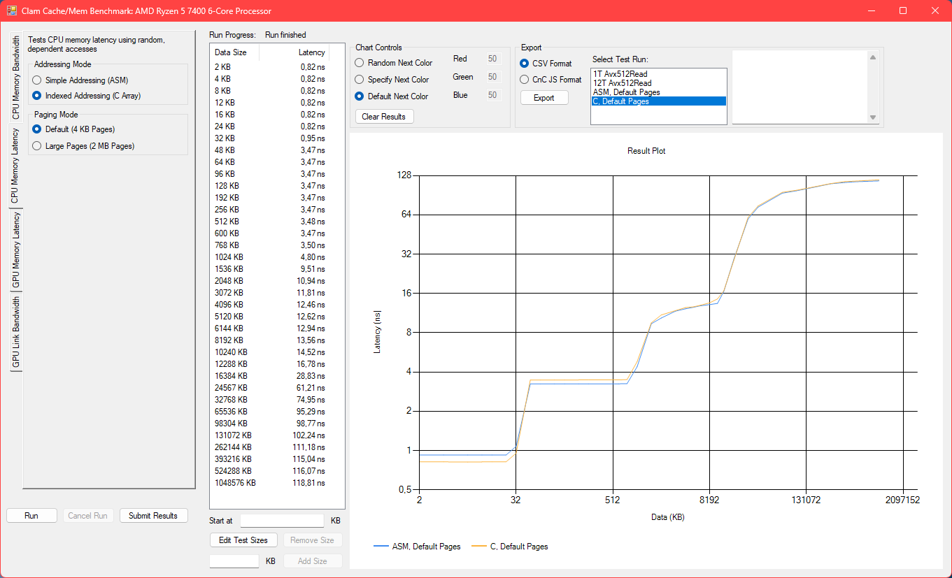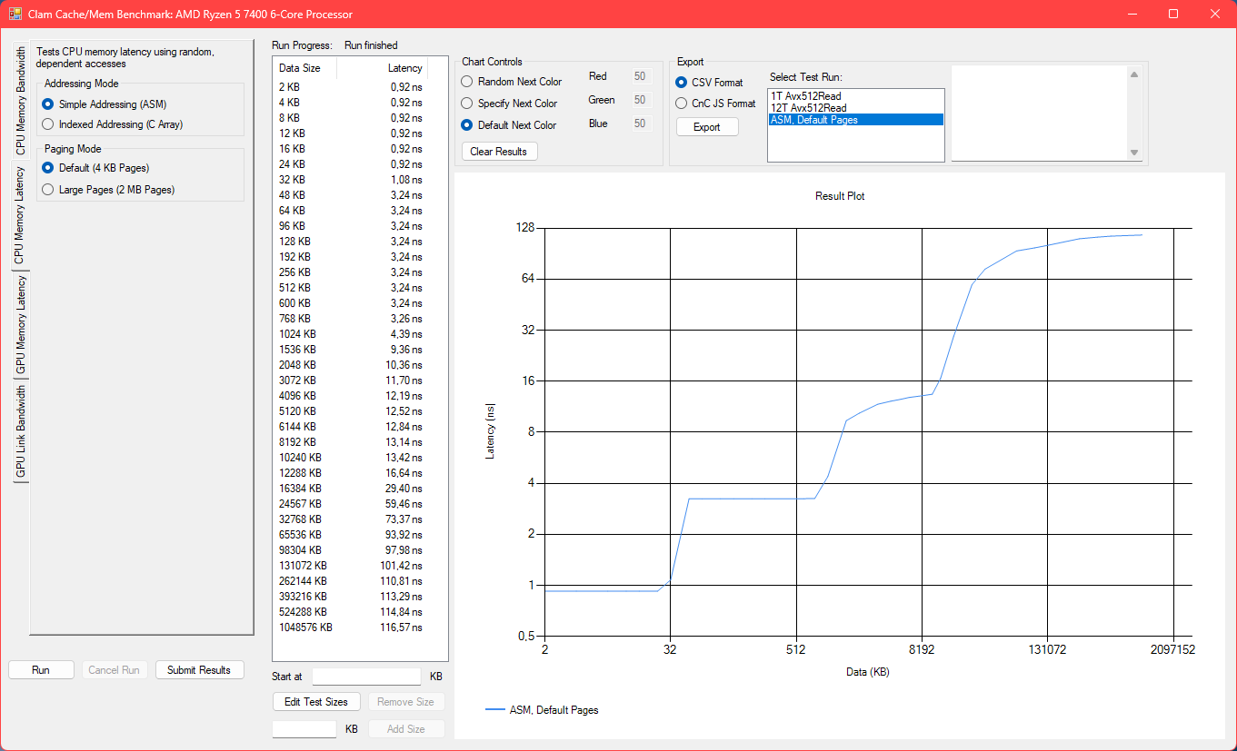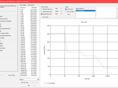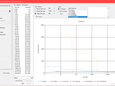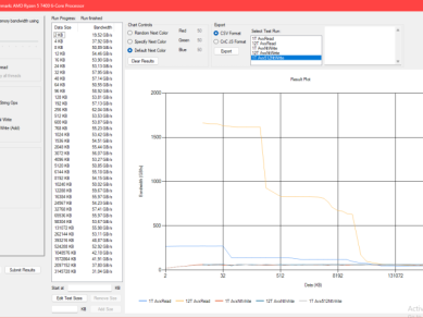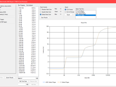 Tato kapitola je aktuálně novinkou, chtěl jsem totiž nějak lépe testovat paměťovou propustnost a také latence pamětí. To se všeobecně netestuje zrovna snadno a test v AIDA64 je takový velmi rychlý, nicméně na rychlé ověření, že jsou paměti nastavené správně postačí. Využívám tak programu Microbenchmark v GUI variantě, která kreslí i veselé grafy. Program umí testovat čtení i zápis do paměti mnoha způsoby, nechybí i testování latencí RAM.