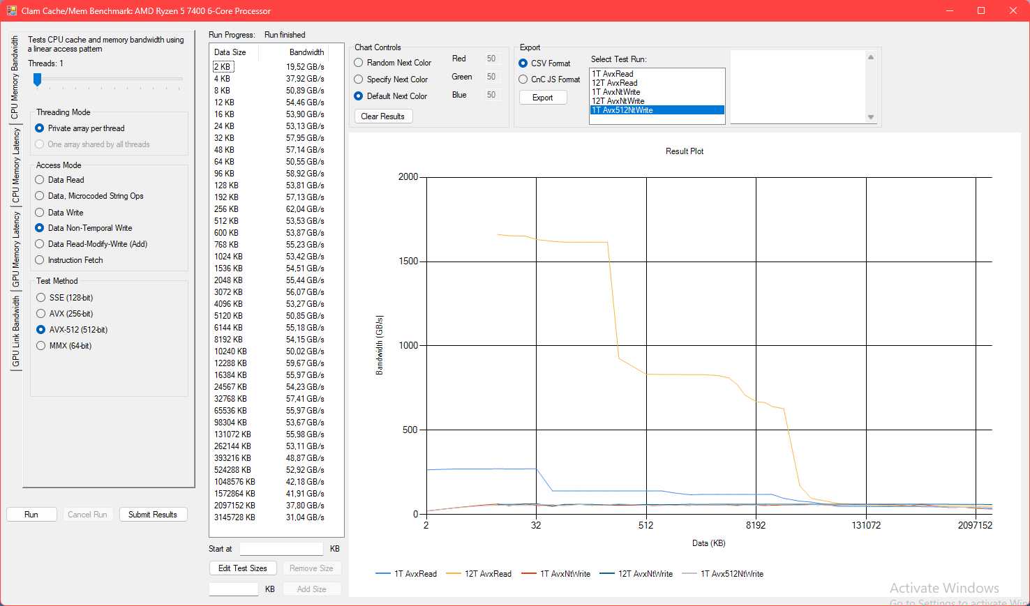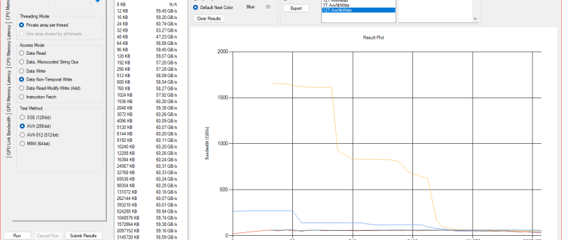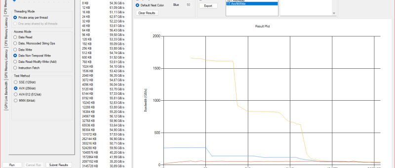 Důležitá je samozřejmě i rychlost zápisu do paměti. Opět zkouším nejprve jedno CPU jádro/vlákno s AVX instrukcemi a očekávám nižší propustnost oproti všem dostupným vláknům.