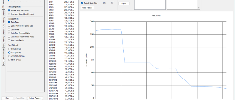 Nejprve se podíváme na rychlost čtení paměti, pokud se použije pouze jedno CPU jádro/vlákno. Do srovnávacího grafu uvádím hodnotu u "nejvzdálenějšího" množství paměti, čímž se eliminuje vysoká propustnost L1/L2/L3 cache. Na screenshotu ale můžete vidět i jednotlivé kroky, jak nám propustnost postupně klesá.