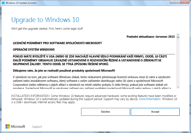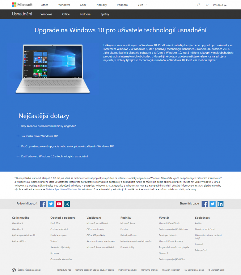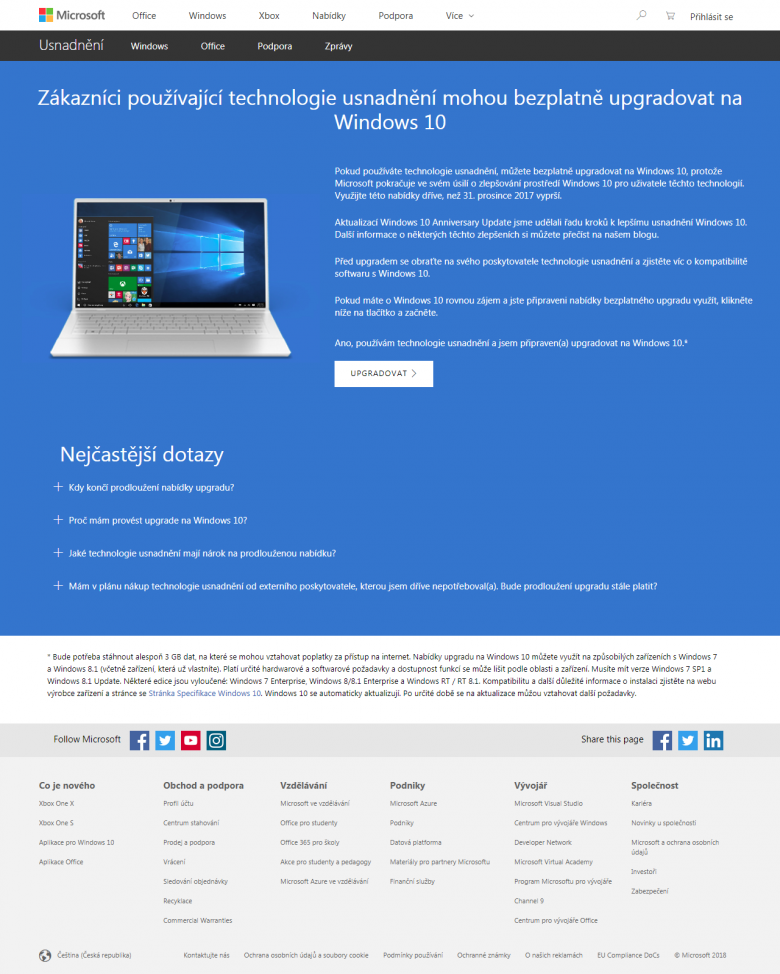 Dnes máme 17. ledna 2018, upgrade zdarma přes usnadnění (accessibility) by již neměl být dostupný, ale v době přípravy tohoto článku funguje jak česká, tak i anglická jazyková mutace stránky, která jej nabízí: