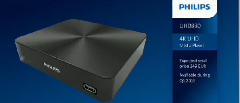 Majitelé TV Philips řad 8809, 8909 curved, 9109 a 9809 jej dostanou příští rok zdarma, přehrávač pak podporuje přehrávání UltraHD H.265 obsahu na všech firemních TV od roku 2013 výše. Krabička samotná obsahuje vedle konektorů USB A Ethernet také Wi-Fi, výstupem je HDMI 2.0 a podporováno je UltraHD až do 60 fps a s 10bitovými barvami.