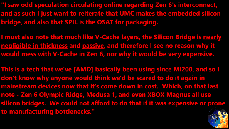 V podstatě řečnickou otázkou však vyvolal vlnu spekulací, které už si žily nekontrolovaně vlastním životem a jejichž výsledkem byly diskuze na téma, že Zen 6 má problém s V-cache a že v důsledku nové metody pouzdření s křemíkovými můstky bude drahý.