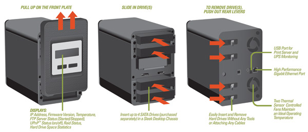 D-Link přidává do své nabídky další síťové úložiště DNS-343 do kterého se dají umístit až čtyři 3,5palcové SATA disky. Ty se dají zapojit jako JBOD, RAID 0, 1 a 5 nebo standardně a vůbec není nutné hned nakupovat všechny čtyři, dají se přidávat postupně, jak porostou vaše datové nároky, nebo jak budete krmit své prasátko. Nemusíte mít obavy ani z instalace těchto disků, nebudete muset nic odkrývat a zapojovat kabely, postačí je jen „zacvaknout“. Na předním panelu je OLED displej, kde najdete například informace o IP adrese zařízení, volné kapacitě, vnitřní teplotě, nastaveném RAID módu atd., indikační LED pak zobrazují připojení do počítačové sítě (10/100/1000Base-T), přítomnost jednotlivých disků a zapnutí.