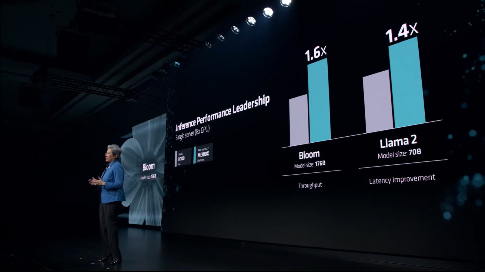 Na to záhy reagovala AMD, která upozorňuje, že výsledky zveřejněné Nvidií jsou v několika ohledech zavádějící. Nvidia Instinct MI300X netestovala a jeho výkonnostní výsledek, který uvádí v grafu, se pokusila získat přepočtem z latencí, které uvádí AMD. Zásadnější problém však je, že výsledky doplněné Nvidií (zelené) byly naměřeny v přesnosti FP8, nikoli v FP16, ve které srovnávala AMD. Jde tedy o srovnávání hrušek s jablky. Další „změnou“ je, že Nvidia pro srovnání hardwaru nepoužila vLLM (podporuje jak Instinct MI300X tak Nvidia H100), ale pro vlastní hardware optimalizovaný TensorRT-LLM. Jinými slovy výsledky zveřejněné Nvidií pocházejí z odlišné konfigurace softwaru a byly naměřeny při nižší přesnosti.