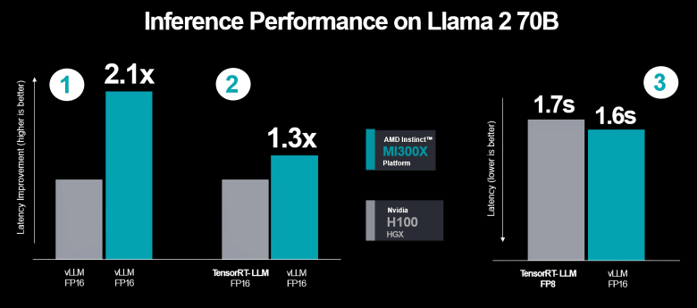 AMD k tomu dodala, že ony „1,4× lepší“ latence, které uváděla při vydání Instinct MI300X, již stejně není aktuální údaj, neboť pokročila s optimalizacemi softwarové platformy a v současnosti se již dostala na latence 2,1× lepší oproti tomu, co ve stejném softwaru a se stejnou přesností (FP16) nabízí Nvidia H100. I když se pro hardware Nvidie použije tensorRT-LLM, zůstává AMD 1,3× lepší latence a dokonce i při použití nižší přesnosti (FP8) u Nvidie a vyšší (FP16) u AMD má již s optimalizacemi provedenými v posledních týdnech AMD mírně lepší výsledek.