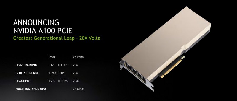 Nvidia uvedla akcelerátor A100 postavený na 7nm GPU Ampere GA100 jako řešení se 40 GB paměti typu HBM. K dispozici byl jak v podobě modulu (TDP 400 wattů), tak v podobě PCIe verze (TDP 250 wattů). Tehdy došlo k určitému zmatku, neboť Nvidia původně zveřejnila, že PCIe verze bude o 10-50 % pomalejší a po zveřejnění této informace v médiích své vyjádření korigovala na 10-33 %.