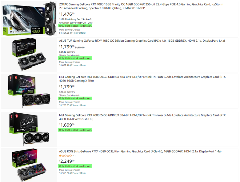 Amazon, který prodává do celého světa, to dokonce řeší omezením zásob - většinu modelů GeForce RTX 4080 již drží na skladě pouze po jednom kuse.