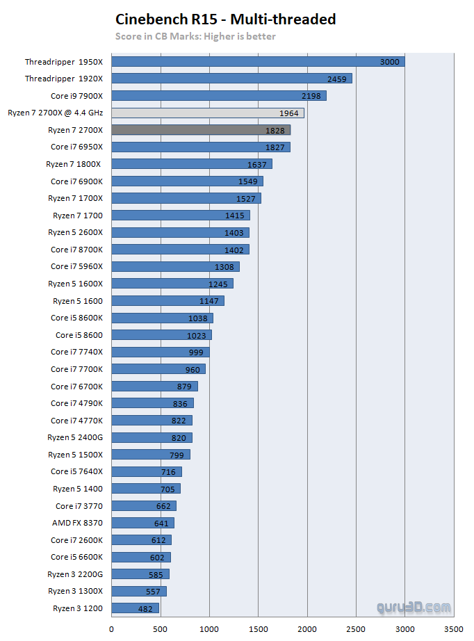 Osmijádrový Coffee Lake dosahuje skóre 2212 bodů, kterým překonává dokonce i desetijádrový Skylake-X. Intelu se zkrátka daří ze 14nm procesu ždímat čím dál tím víc. Pro srovnání s dalšími procesory pomůže graf vypůjčený z Guru 3D: