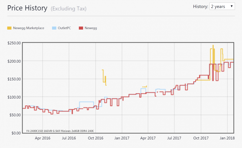 Pokud to vezmeme z pohledu běžného uživatele, který jako koncový produkt kupuje DDR4 paměti (u ostatních nemůže cenu sledovat přímo, protože jsou integrované v nějakém disku, grafické kartě a podobně, kde cenu ovlivňuje i řada dalších faktorů), tak nejnižších cen dosáhly v polovině roku 2016 a od té doby už pouze stoupaly.