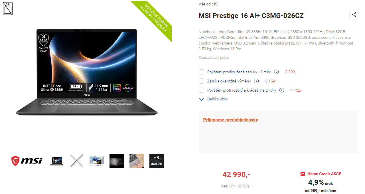 MSI Prestige 16 AI+ s Core Ultra X9 388H za 42 990,-? (Alza)