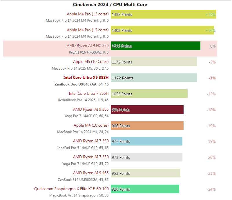 Notebookcheck naměřil, že v Cinebench 2024 dosahuje Ryzen AI 9 HX 370 o 3 % vyššího výkonu než Core Ultra X9 388H, zatímco v Geekbench 6.5 je Core o 16 % rychlejší než Ryzen. Pokud by vás zajímalo srovnání se Strix Halo, doplnil jsem výsledky do níže uvedené tabulky vpravo: