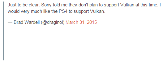 Toto přání se zdá být nejen smysluplné, ale také realizovatelné. Minulá generace, tedy Playstation 3, krom nativního low-level API GCM přinesla později ještě podporu PSGL (vycházející z OpenGL ES a Nvidia CG) a klasického OpenGL. Dávalo by vcelku dobrý smysl, pokud by Sony u Playstation 4 k nízkoúrovňovému API GNM a high-level GNMX doplnila nástupce OpenGL: Vulkan.