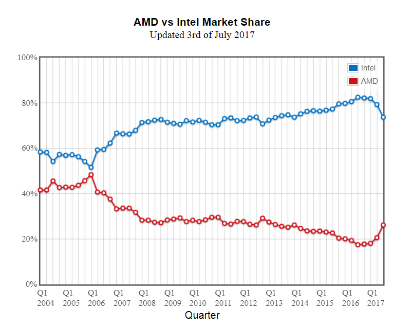 K prvnímu červenci byly zveřejněny průběžené výsledky za třetí kvartál letošního roku, které byly natolik zajímavé, že je převzala mnohá média: Znamenala totiž za historii monitoringu největší mezikvartálový nárůst podílu AMD a největší mezikvartálový propad Intelu. Podíl AMD stoupl z 21 na 31 %, podíl Intelu klesl ze 79 na 69 % (zaokrouhleno na celá procenta). Desetiprocentní posun z kvartálu na kvartál je bezprecedentní, podobný byl jen posun opačným směrem o 7 % v první polovině roku 2006, po uvedení Intel Core.