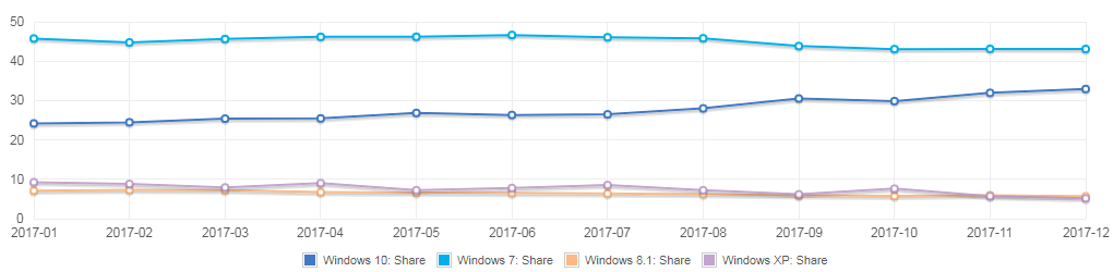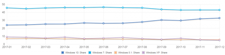 Od hodnocení desítek tu ale tentokrát nejsme, řeč má být o jejich podílu. Nikoli podílu na trhu, ale podílu mezi uživateli, takže mluvíme v podstatě o jejich rozšíření. Konkrétně v segmentu osobních počítačů - desktopových i mobilních a to podle statistik Net Marketshare. Ke konci prosince dosáhly Windows 7 podílu 43,08 %, Windows 10 32,93 %, Windows 8.1 na třetím místě s 5,71 % padají na úroveň XPéček, které mají 5,18 %. Další operační systémy zůstávají pod 5% hranicí, přičemž jediný, který by jí mohl atakovat, je Mac OS X 10.12. Zajímavé je snad jen to, že Ubuntu překonalo Visty (hovoříme ale o podílech mezi 0,6-0,7 %).