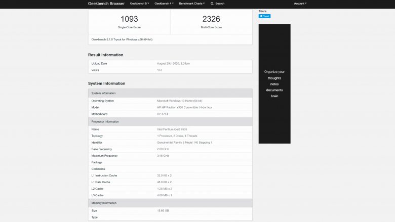 Pentium Gold 7505 je Tiger Lake (netřeba připomínat, že mobilní, desktopový se nechystá) se dvěma jádry a čtyřmi vlákny, základním taktem 2 GHz a boostem 3,5 GHz. Takové údaje se objevily v databázi Geekbench, zároveň s výsledky tohoto benchmarku: