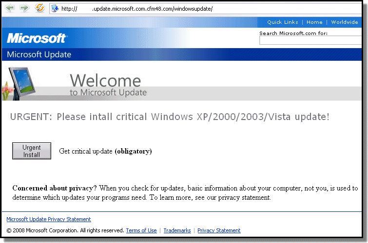 Tým lidí z F-Secure informuje na svém blogu o existenci nového laciného triku, jak uživatele přimět k instalaci zákeřného softwaru. Útočníci si tentokráte vzali na paškál web Microsoft Update, když na svém webu na doméně cfm48.com dosti nešikovně falšují jeho obsah a vybízejí k urgentní „intalaci“ aktualizace WindowsUpdateAgent30-x86-x64.exe. Pokud si ji uživatel na svém PC spustí, zavede si tak na PC trojského koně, který na něm zanechá breberku. Ta má za úkol zjišťovat přihlašovací údaje k poštovním účtům a sbírat e-mailové adresy, které pak někam odesílá.