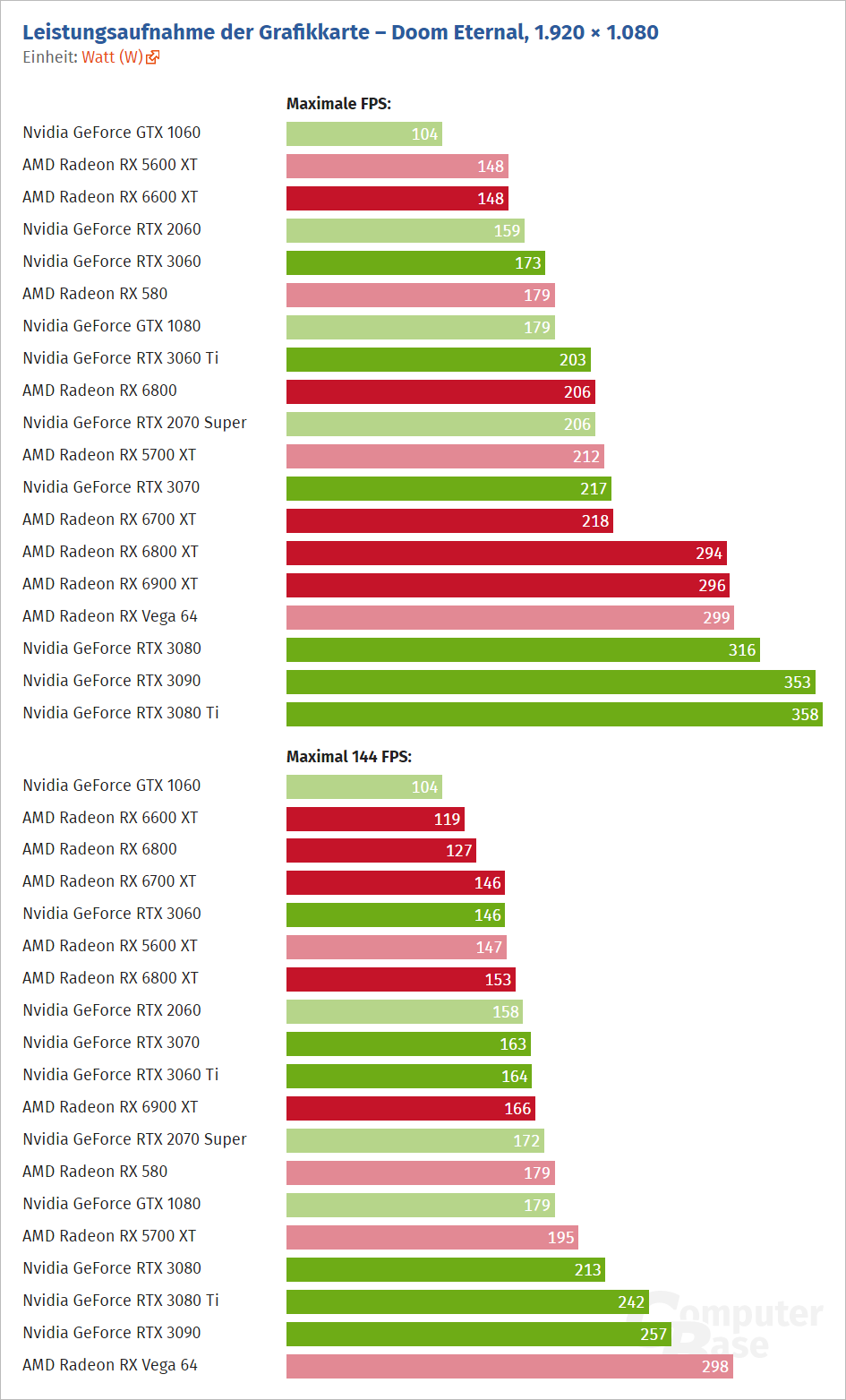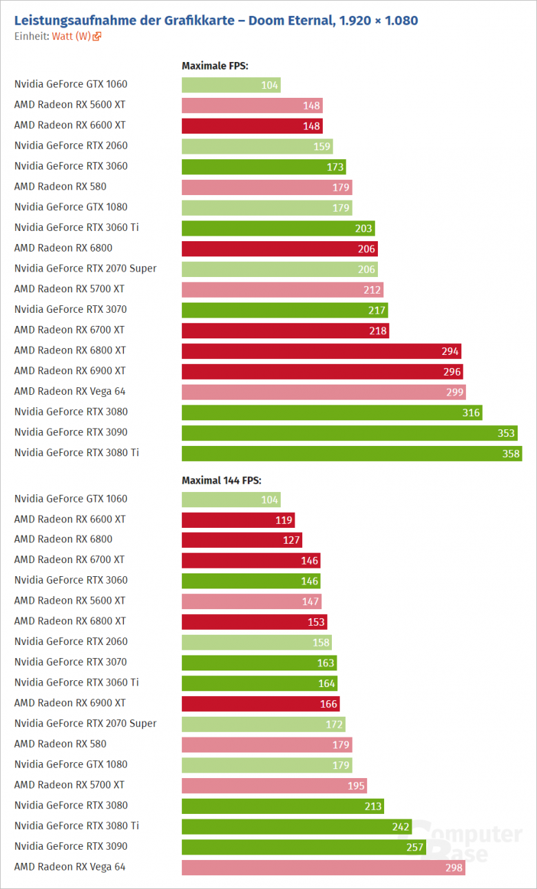 ComputerBase se rozhodl přetestovat spotřebu grafických karet. Krom zahrnutí výsledků s novými ovladači, které a Radeonech snižují spotřebu při přehrávání YouTube videa (čemuž jsme se už věnovali), otestoval spotřebu v herní zátěži (Doom Eternal) v obvykle testovaném nastavení (tedy bez omezení snímkové frekvence) a nově i s omezením FPS na 144.