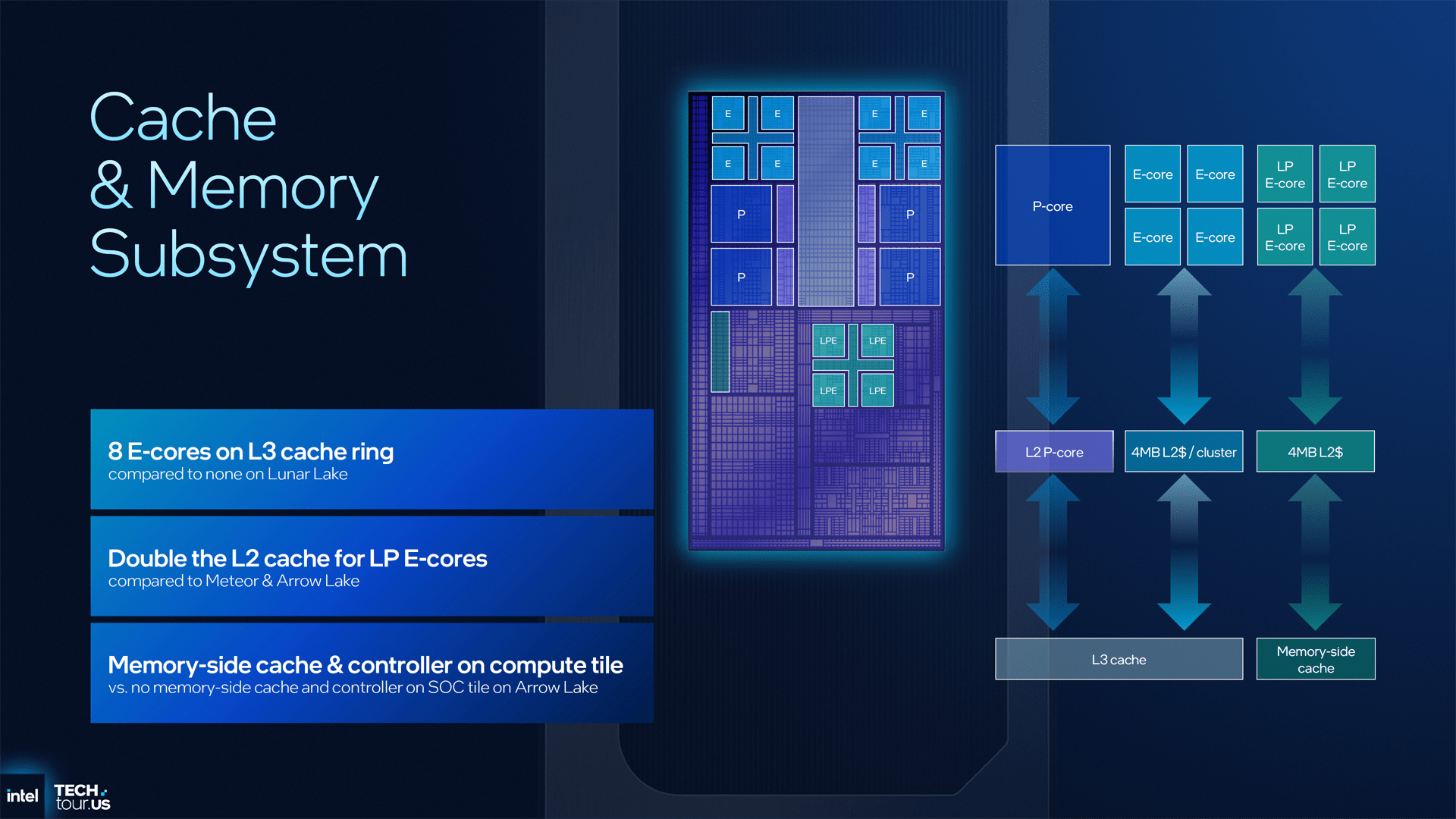 Pokud bychom vyšli z hodnot pro Arrow Lake, pak lze říct, že LP-E jádro má v důsledku nižší taktů jen 55 % výkonu Atomu / E-Core. Pokud odečteme ještě absenci přístupu L3 cache a sběrnici Ring-Bus (L2 cache LP-E jader je připojena přímo ke cache paměťového řadiče), pak lze odhadovat výkon LP-E někde pod 50 % výkonu plnohodnotného Atomu / E-Core. V případě Panther Lake možná o něco vyšší, neboť s ohledem na novější proces a architekturu můžeme připustit, že si co rozdílu v taktech nebudou malá jádra tak vzdálená. Faktem nicméně zůstává, že k L3 cache, která má být 12MB, což by samo o sobě nebylo špatné, mají v případě procesoru Core Ultra 5 332 přístup dvě jádra z celkových šesti.