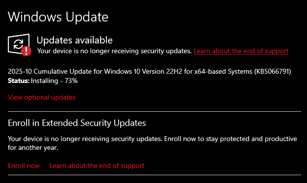 14.10.2025 skončila oficiální podpora operačního systému Windows 10. Microsoft poněkud nečekaně avizoval, že hodlá nabízet jeden rok aktualizací skrze poplatek 35 EUR, aby pomohli organizacím a uživatelům v přechodu na Windows 11.