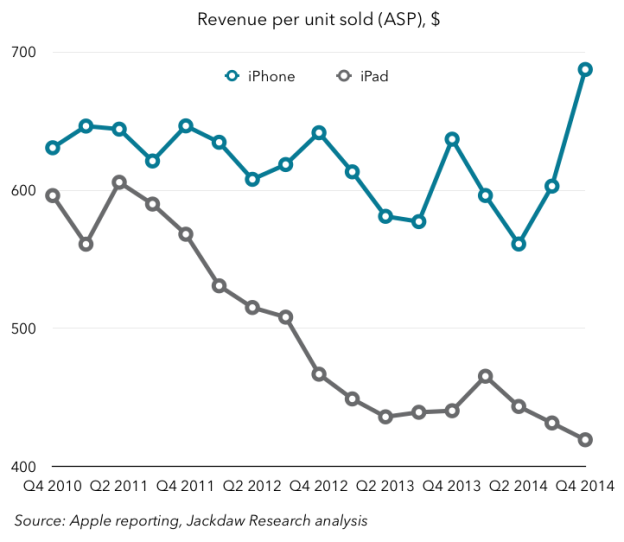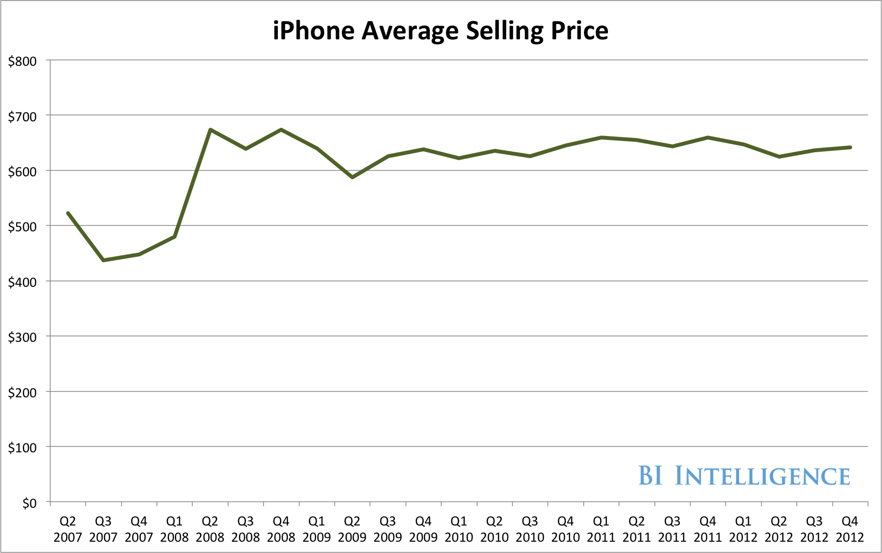 Pro lepší kontext se můžeme podívat na její vývoj od vydání prvního iPhonu. Zpočátku se držela spíš po $500, teprve s vydáním druhé generace iPhone 3G v polovině roku 2008 se vyšvihla přes $650. Pak došlo na iPhone 3GS, který už tak vysoké příjmy v přepočtu na prodaný kus negeneroval; situaci zlepšil až úspěšný iPhone 4, s nímž se opět průměrná prodejní cena zvedla nad $650.