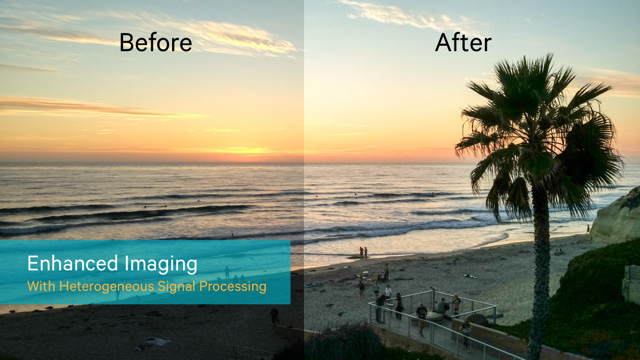 Podporovaný je také snímací režim zvaný Low Light Vision (LLV), který v podstatě prosvětluje tmavé části obrazu a vytváří iluzi vyššího dynamického rozsahu (podobné funkce možná znáte z některých fotoaparátů, které je nabízejí již po léta). Zrovna ilustrační snímek Qualcommu ale není ideální ukázkou možností a vhodného použití - v případě náladového západu slunce likviduje atmosféru. Ale to už je věcí použití, ne věcí samotné technologie. Integrován je modem LTE X12, 3×20 MHz, Cat 12/13, 600 / 150 Mb/s (down / up).