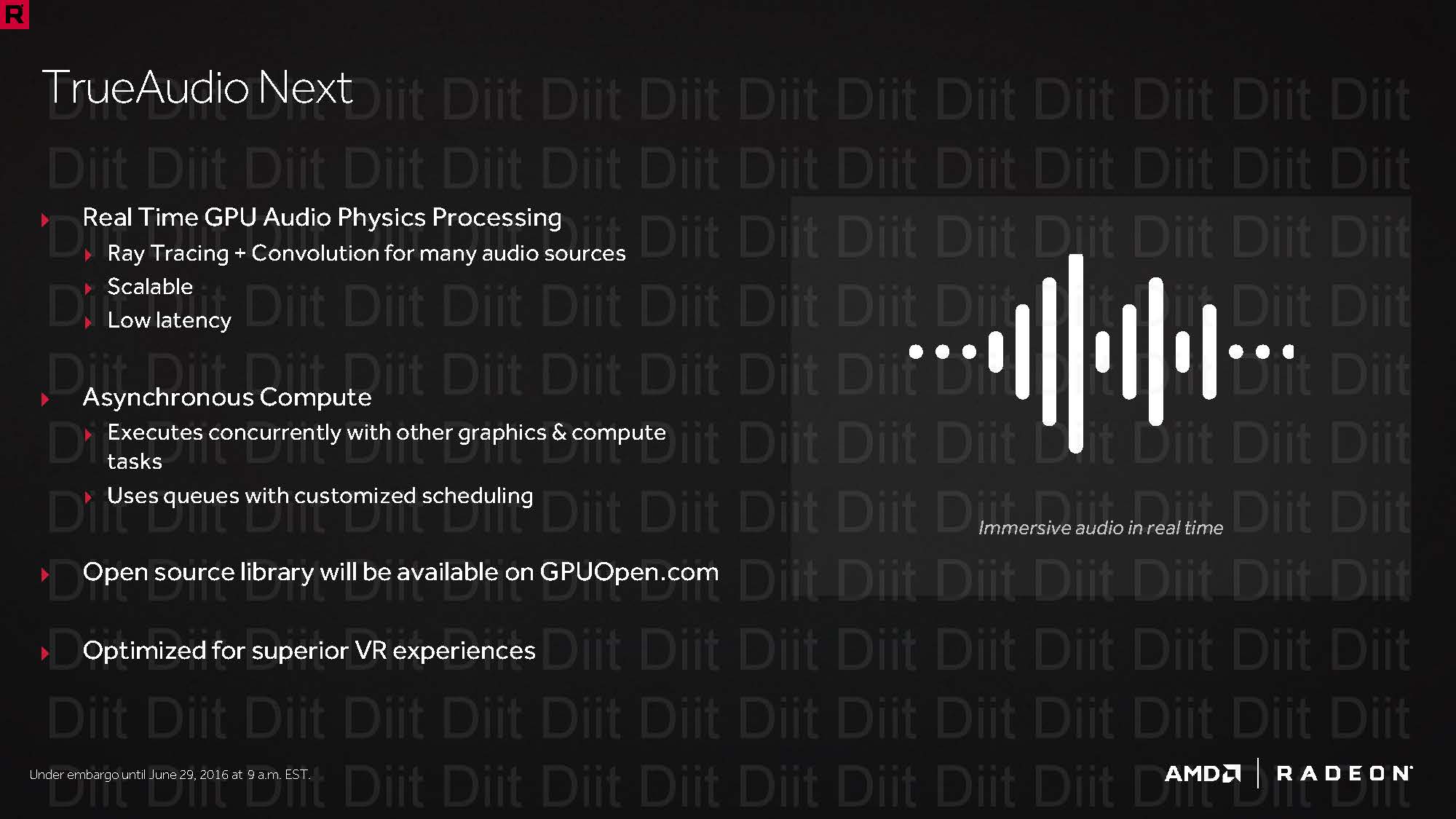 Jednou z nich je pokročilejší podpora prostorového zvuku TrueAudio Next. Podporuje ray-tracing a konvoluci pro více zdrojů zvuku a funguje asynchronně, takže je zpracováváno v samostatné frontě. Vývojářům jsou k dispozici open-source knihovny s efekty.