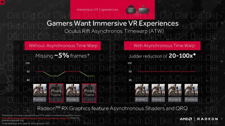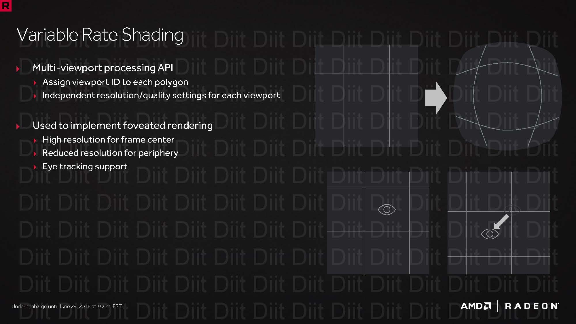 Ať už budeme na podporu virtuální reality nahlížet jako na příčinu nebo logický důsledek výkonu této karty, vzala ji AMD přes cenovou relaci, do které karta míří, poměrně vážně a není podporována pouze stylem: „výkonem na to stačí, můžeme na krabici namalovat logo VR a k němu zelenou fajfku“. Do setu technologií, které AMD označuje souhrnným názvem Liquid VR, přibylo několik novinek.